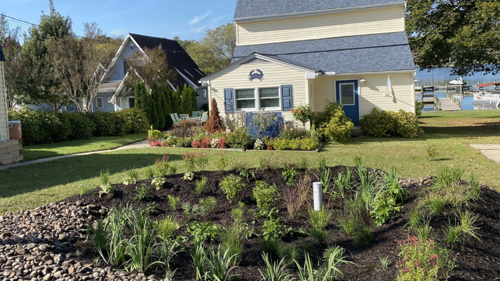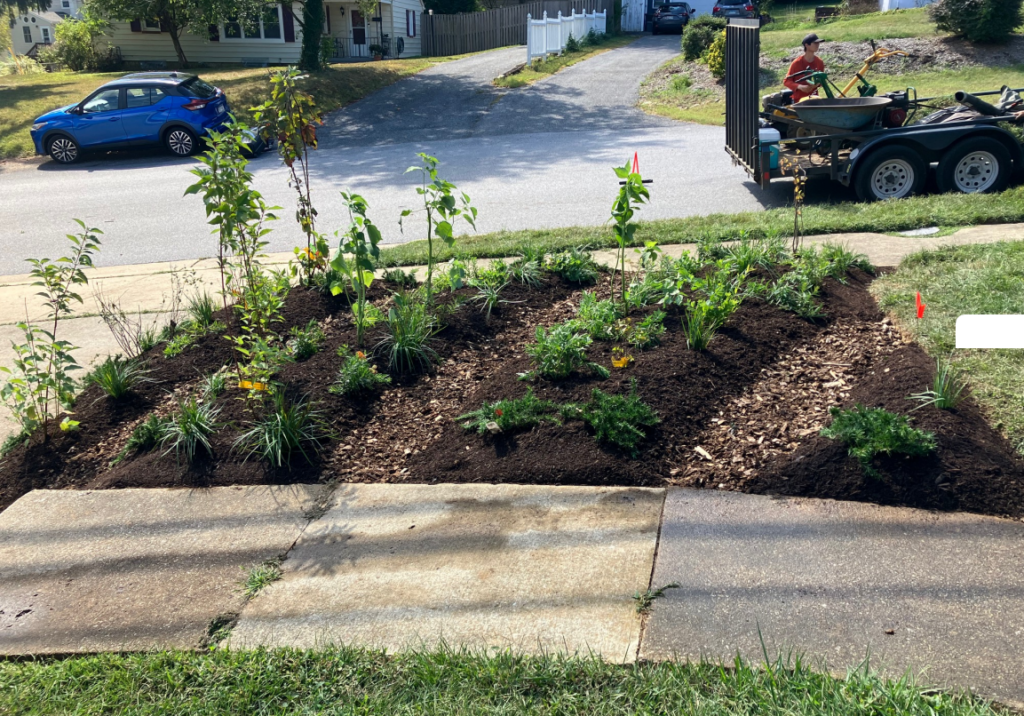 A rain garden is a water-loving garden that helps soak up rainwater from your roof, driveway, or lawn. It is designed to capture water from a 1″ rainstorm and slowly infiltrate it back into the ground. By using native flowers, grasses, shrubs, and trees, a rain garden can beautify your yard while reducing standing water. Rain gardens also provide habitat for:
